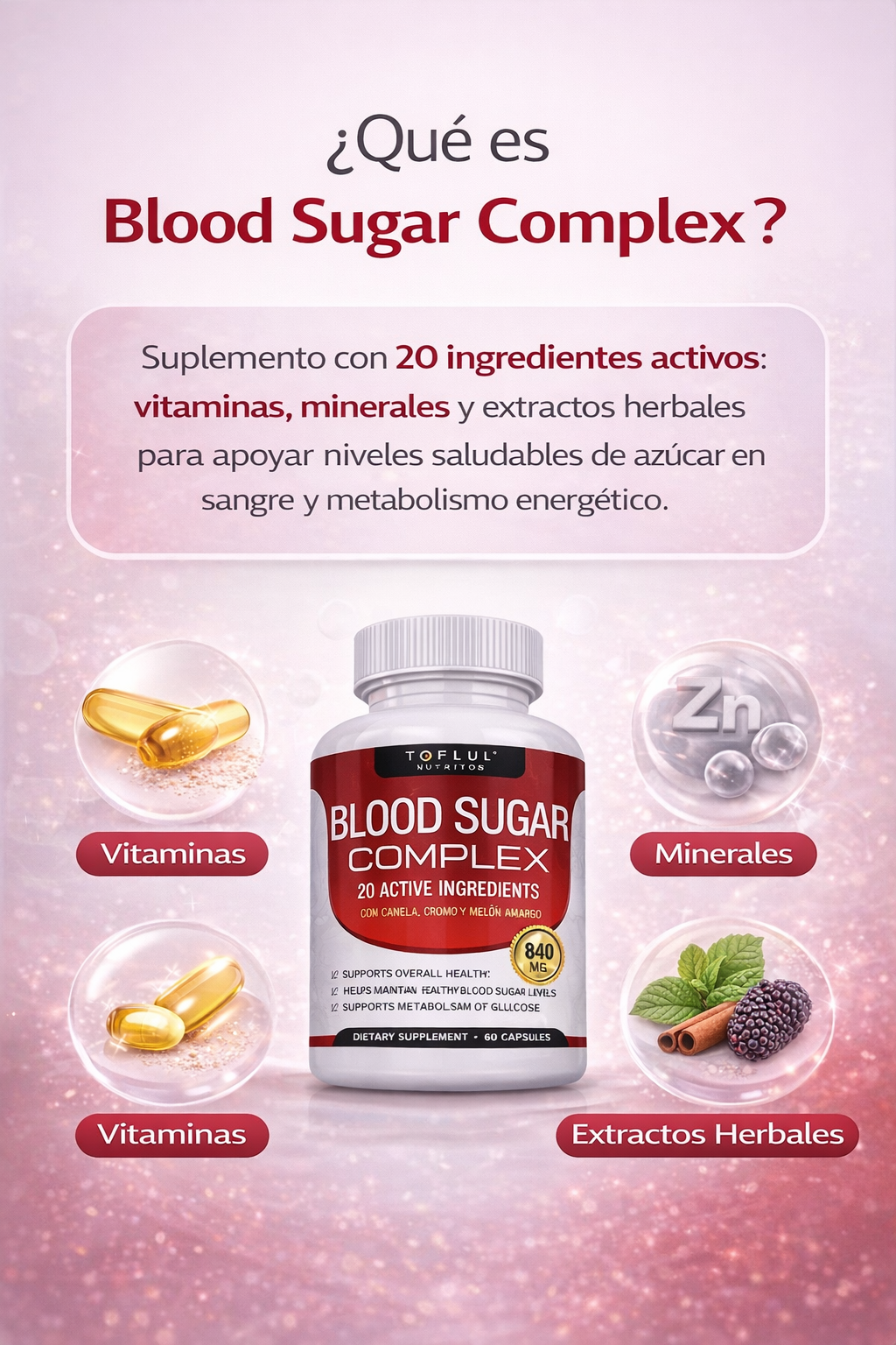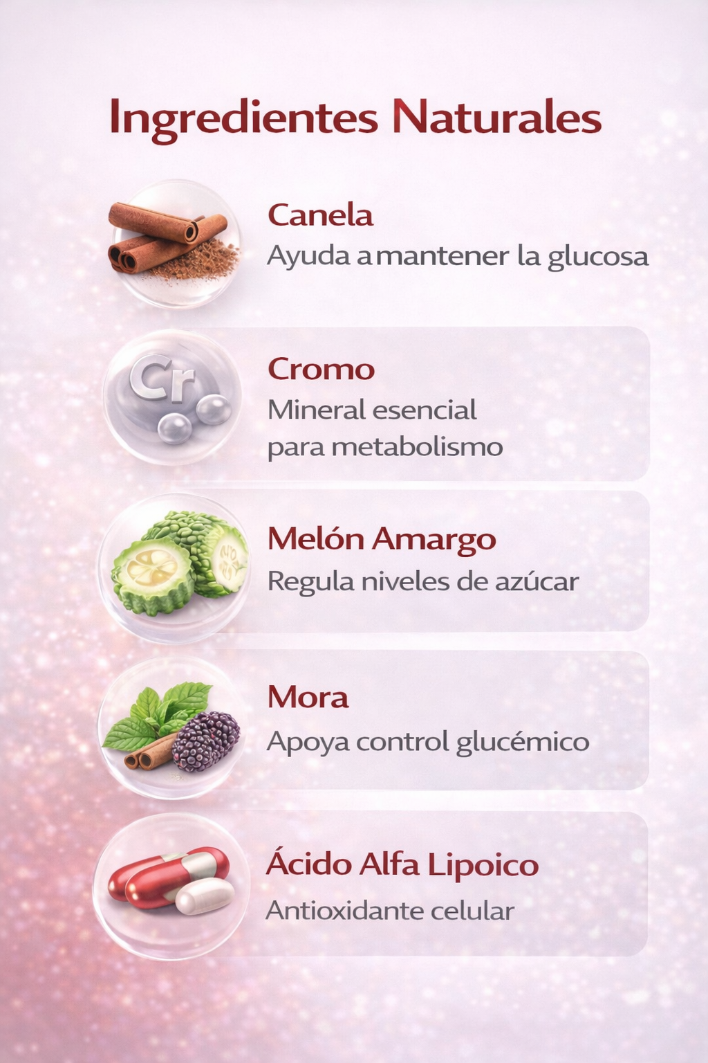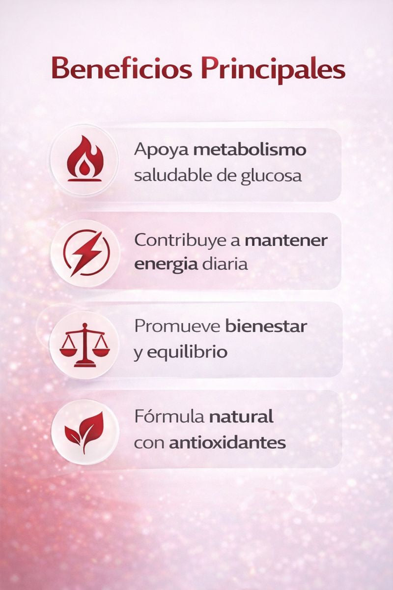 Es un suplemento natural con 20 ingredientes activos que ayudan a mantener niveles saludables de glucosa y apoyar el metabolismo energético.