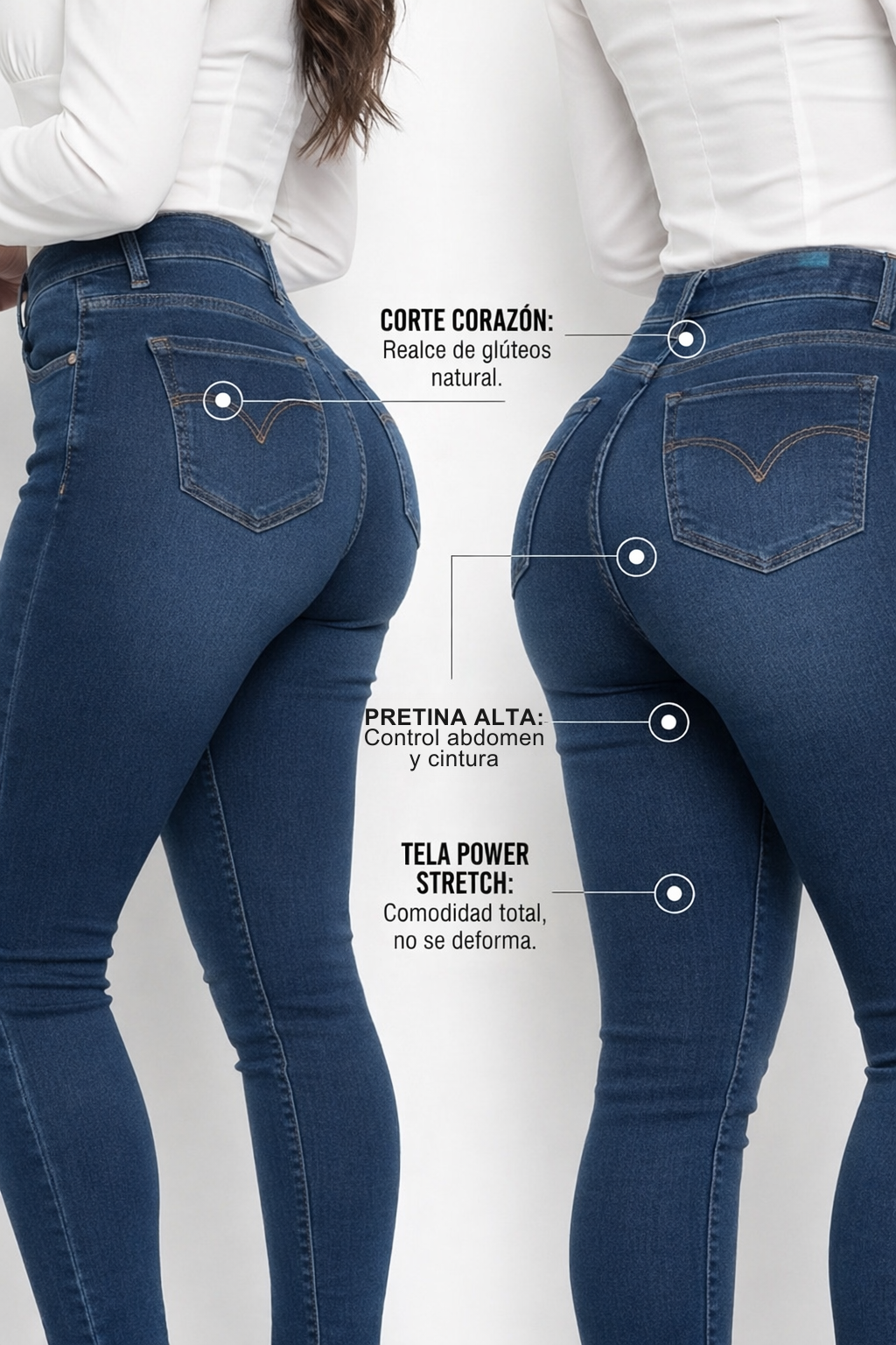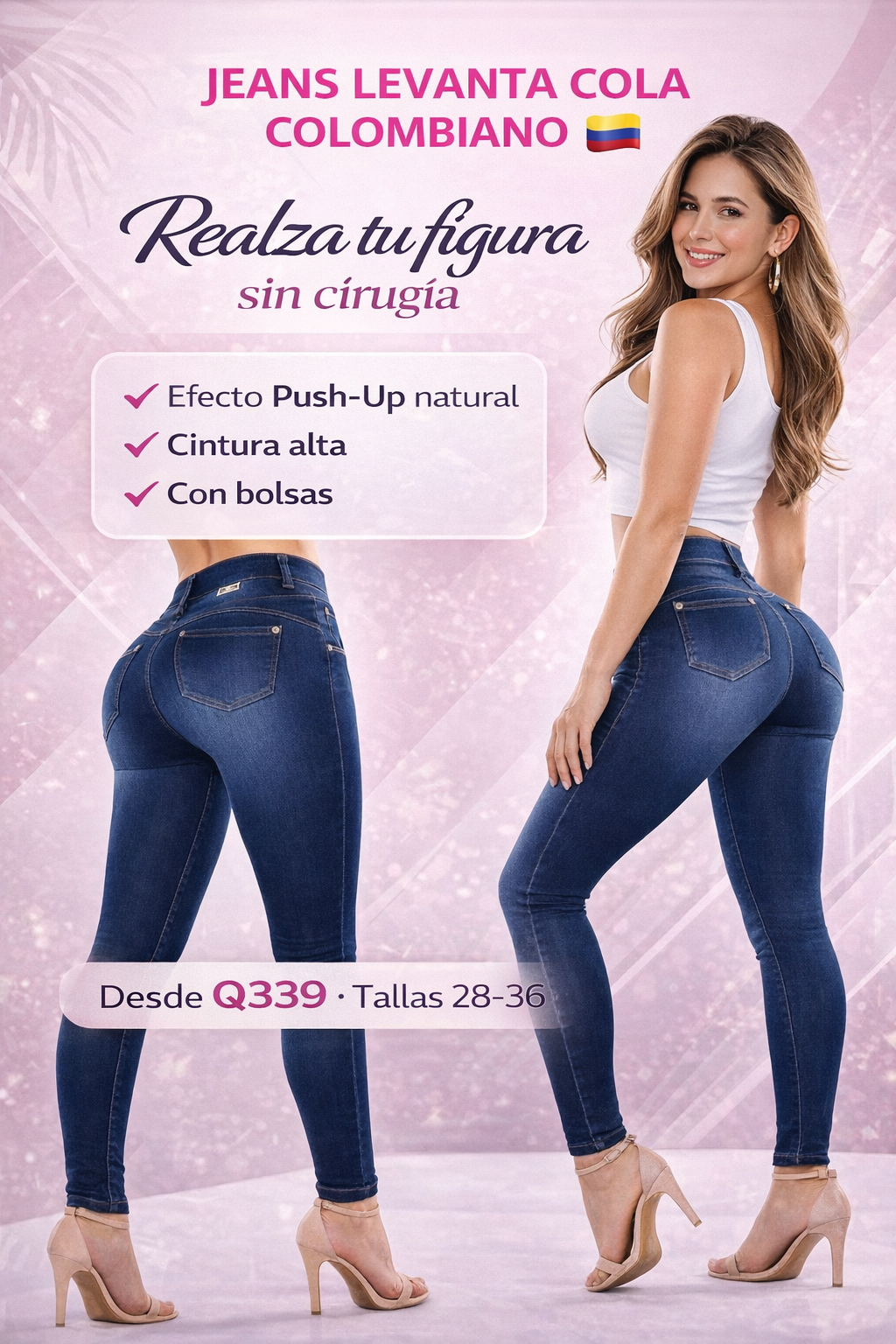 El efecto es 100% real y natural, sin necesidad de rellenos ni cirugía. Se logra gracias al diseño colombiano con pinzas estratégicas, costuras en forma de corazón y pretina alta que redistribuyen y levantan el tejido de los glúteos. Miles de mujeres en toda Latinoamérica confían en esta tecnología probada.