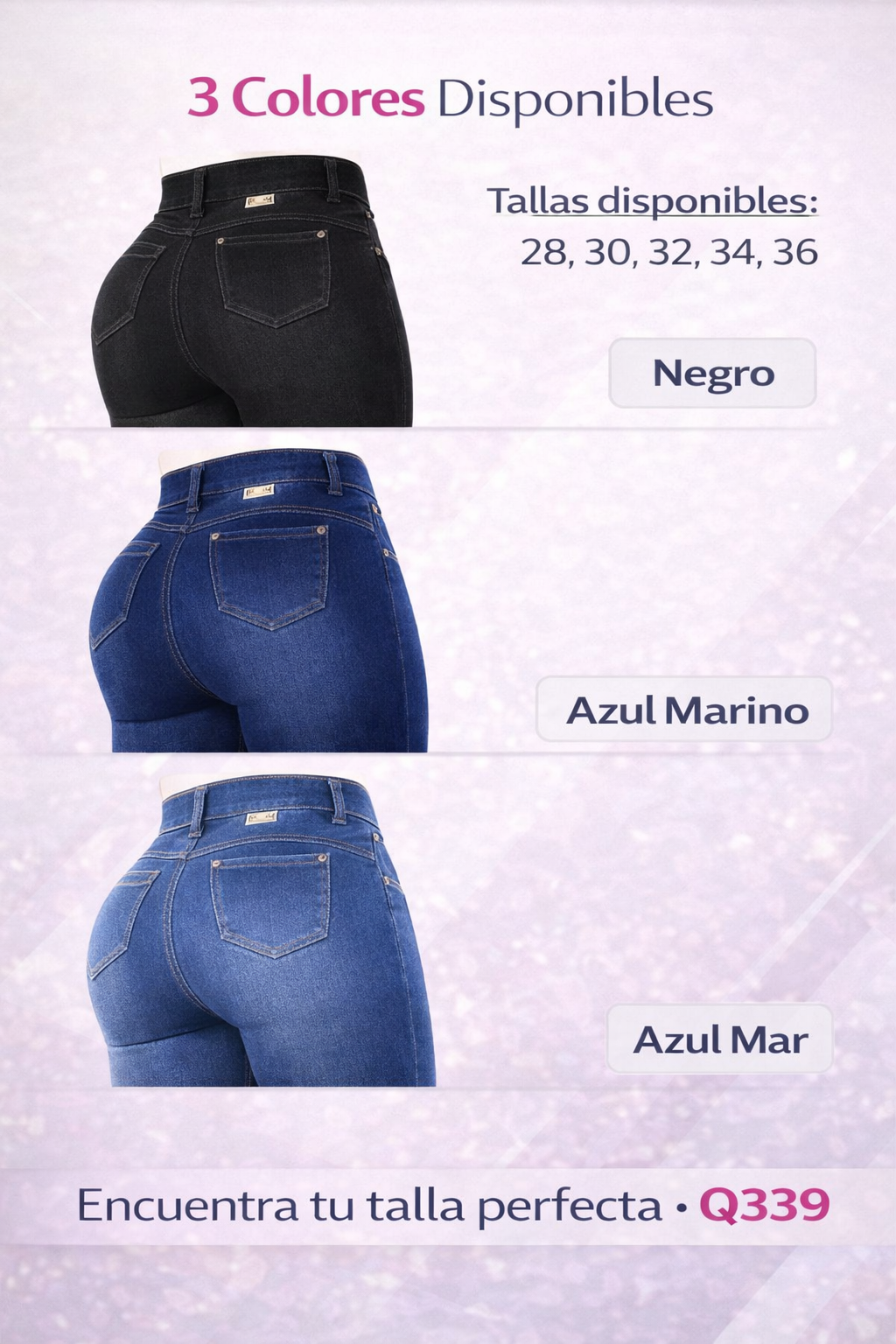 Ofrecemos tallas desde la 28 hasta la 36. Para elegir tu talla, mide tu cintura en centímetros y consulta nuestra tabla de equivalencias (Talla 28 = 68-70cm de cintura, Talla 30 = 73-75cm, etc.). Si estás entre dos tallas, te recomendamos elegir la talla mayor para mayor comodidad. Los jeans tienen un ajuste ceñido por diseño para lograr el efecto moldeador.