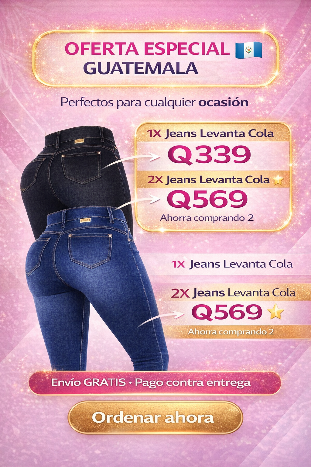 Ofrecemos envío GRATIS a toda Guatemala y pago contra entrega. Recibes tus jeans en la puerta de tu casa y pagas en efectivo al mensajero cuando los tengas en tus manos. Puedes probártelos antes de pagar. ¡Compra 100% segura! Precios: 1X Q339 | 2X Q569.