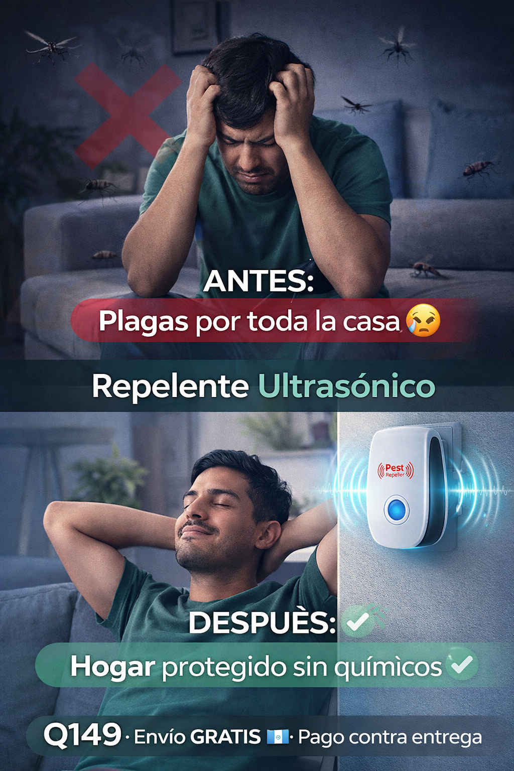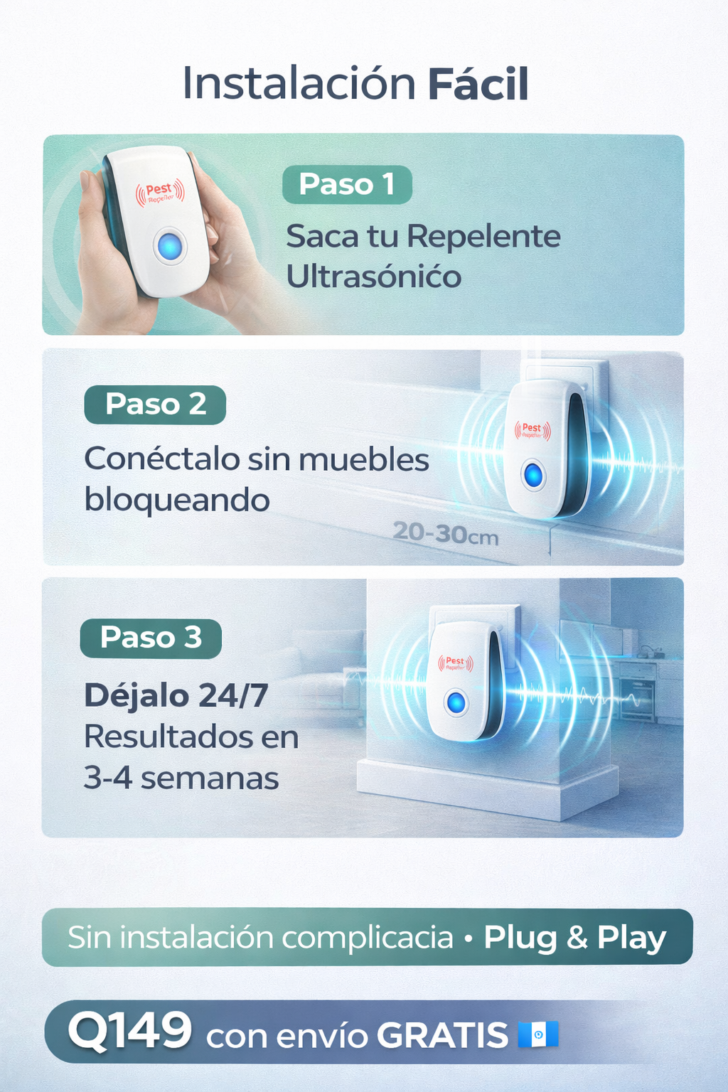 Es un proceso gradual. Durante los primeros 3 a 5 días, es normal notar un ligero aumento en la actividad de los insectos o roedores, ya que el ultrasonido los está obligando a salir de sus escondites. Los resultados definitivos y la eliminación total suelen ocurrir entre la 3ra y 4ta semana de uso continuo.