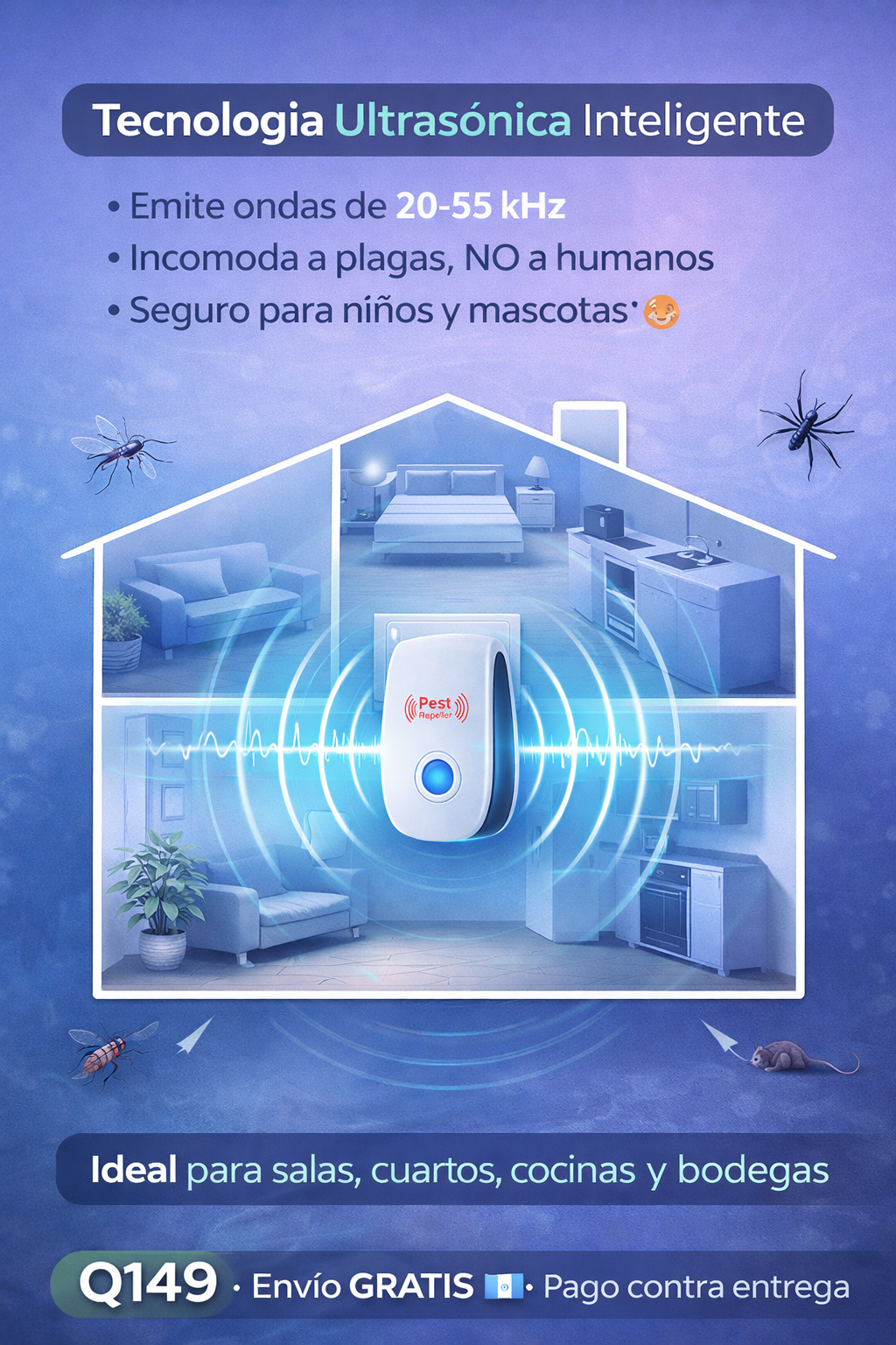 ¡Totalmente seguro! A diferencia de los venenos o trampas químicas, este dispositivo utiliza ondas de ultrasonido que son imperceptibles para humanos, perros, gatos, aves y peces. Es la solución ideal para hogares con bebés y mascotas, ya que no emite olores ni sustancias tóxicas.