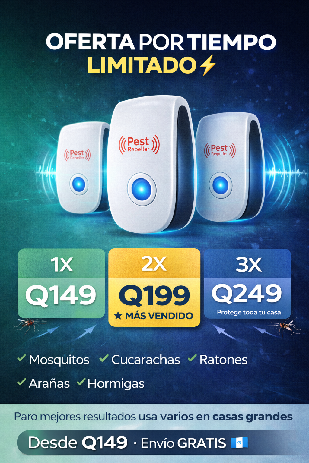 Cada repelente tiene un área de cobertura efectiva de 100 a 150 metros cuadrados. Sin embargo, las ondas ultrasónicas no pueden atravesar paredes sólidas. Para obtener los mejores resultados, recomendamos instalar un dispositivo en cada habitación donde haya problemas de plagas o en áreas grandes como salas y cocinas.